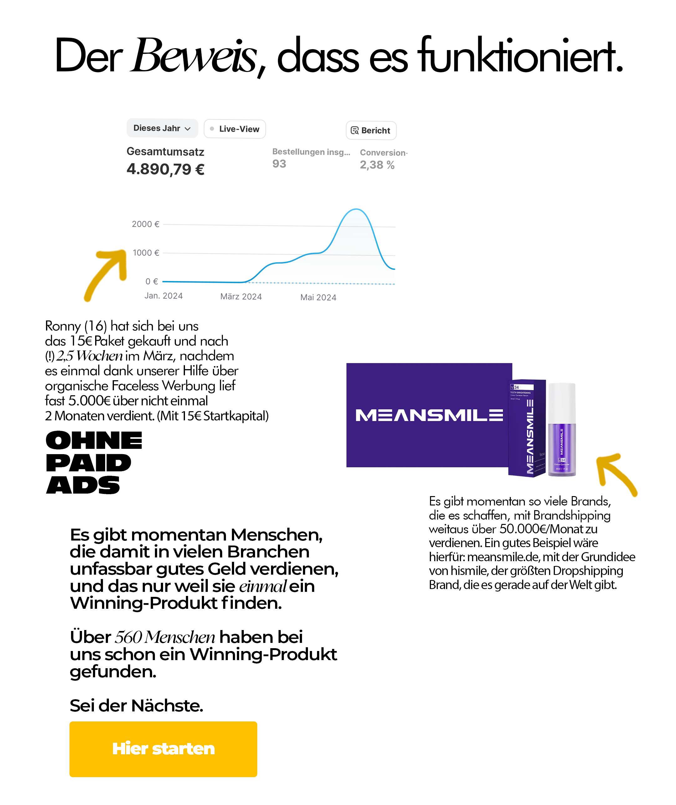 Ein wirklich neues Business (Klar, es gibt manche , die bereits Geld mit Brandshipping verdienen, aber unsere Vorlagen sind neu und innovativ im DACH-eCom Markt, das heißt, die Online-Shops werden zu 100% konvertieren.)