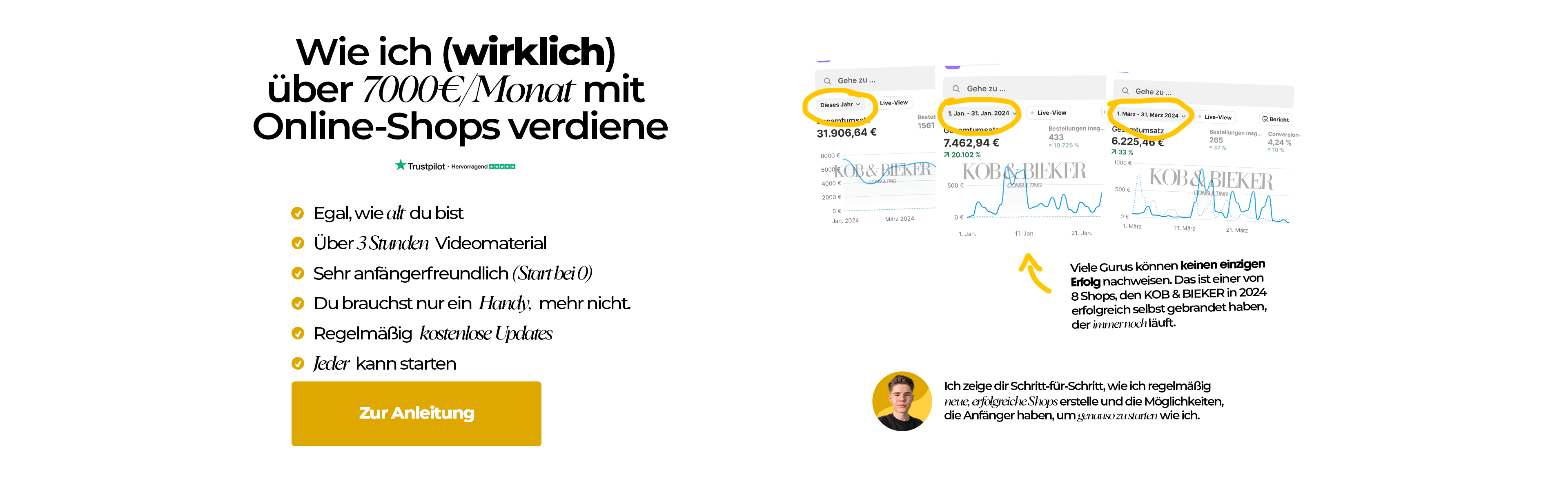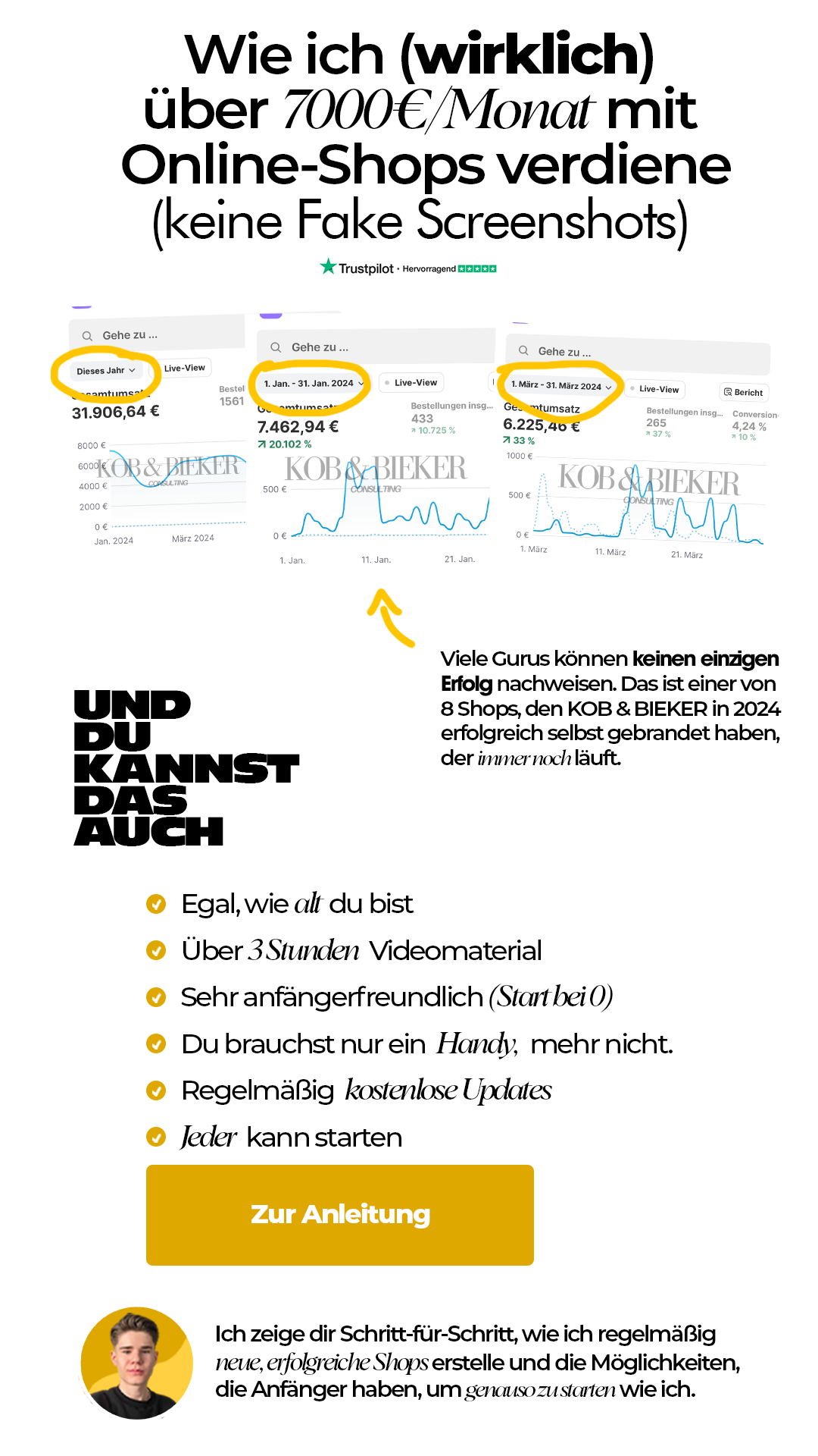 0€ Startkapital (Der Kurs kostet zwar 15€, aber du brauchst bei K&B keine Produkte, die du erstmal kaufen musst, alle anderen Tools sind erstmals kostenlos, außer Shopify, das kostet 1€/Monat.)
